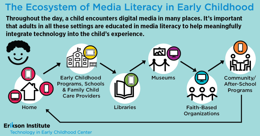It is also essential for adults to understand the network of communication and information in early childhood development. As the diagram below illustrates, children navigate multiple ecosystems that impact their digital aptitude. Adults can leverage this information to safely integrate technology into a child’s life and, importantly, the skills to navigate the information.